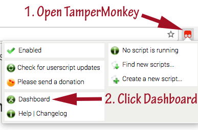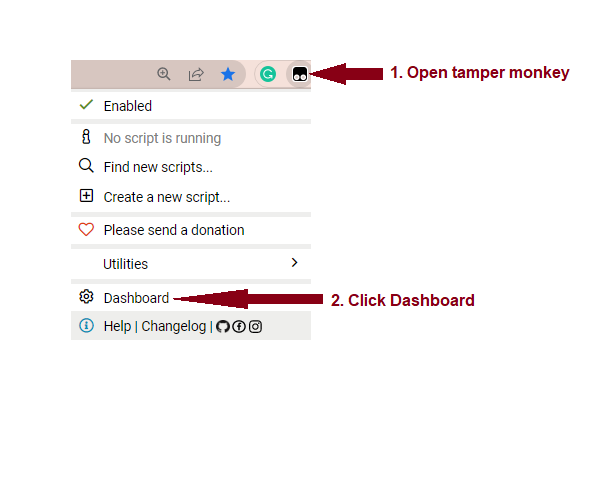 - Click on the "Tampermonkey" extension icon in your browser bar (it looks like a black or red square with rounded corners, and two grey circles at the bottom of the square):
