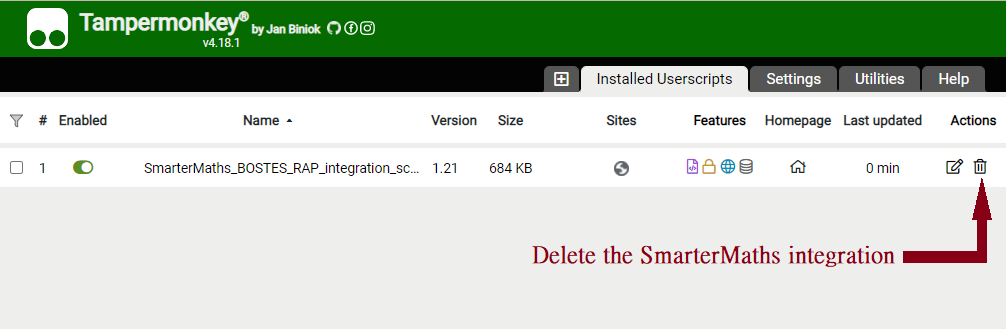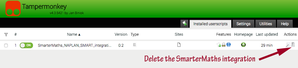 - Choose "Dashboard". You should see the SmarterMaths script listed, and click on the right-most icon to delete the SmarterMaths script so it won't show on your SMART portal in the future. [You can also remove the tampermonkey extension itself if you'd like, although this is not required.]: