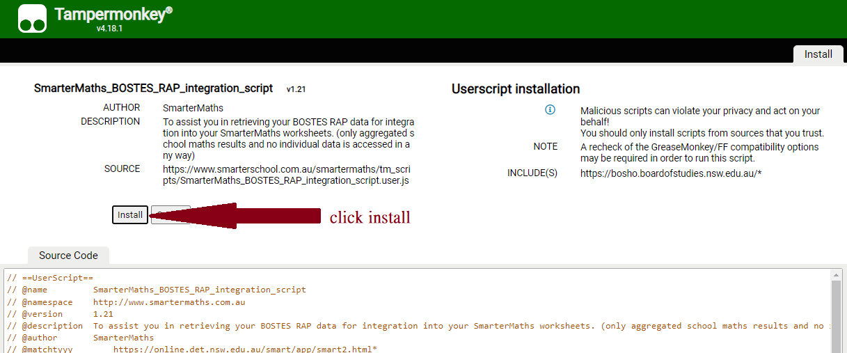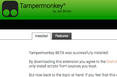 - You should see the following in your browser at this point, and can click install. If you don't see this, then please repeat step 1 to ensure that the "Tampermonkey" extension is correctly installed.