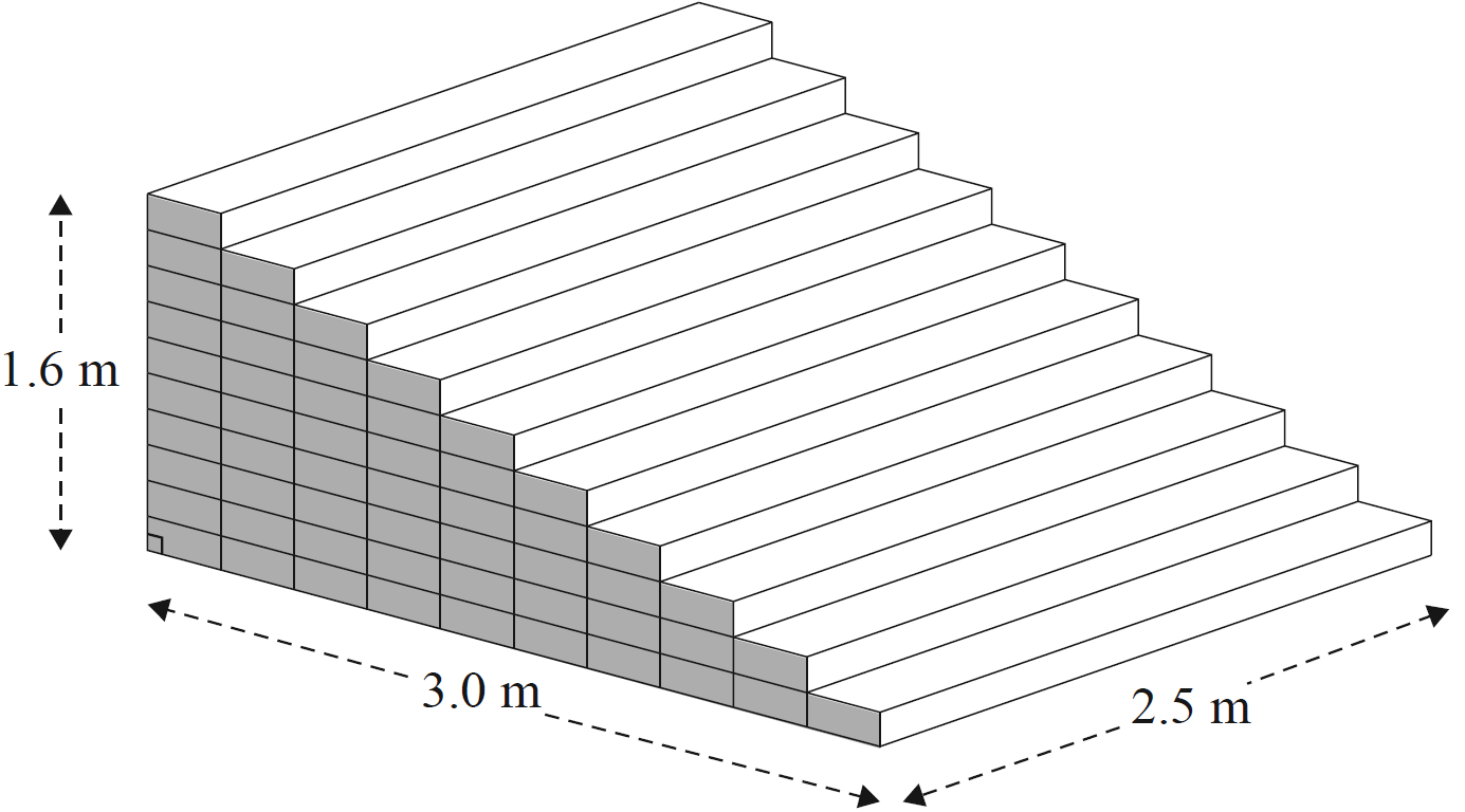 - Find the volume of the solid concrete staircase in cubic metres. (2 marks)