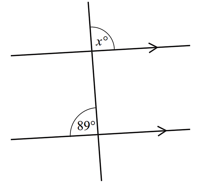 Determine, giving reasons, if the two lines cut by the transversal in the diagram below are parallel. (2 marks)