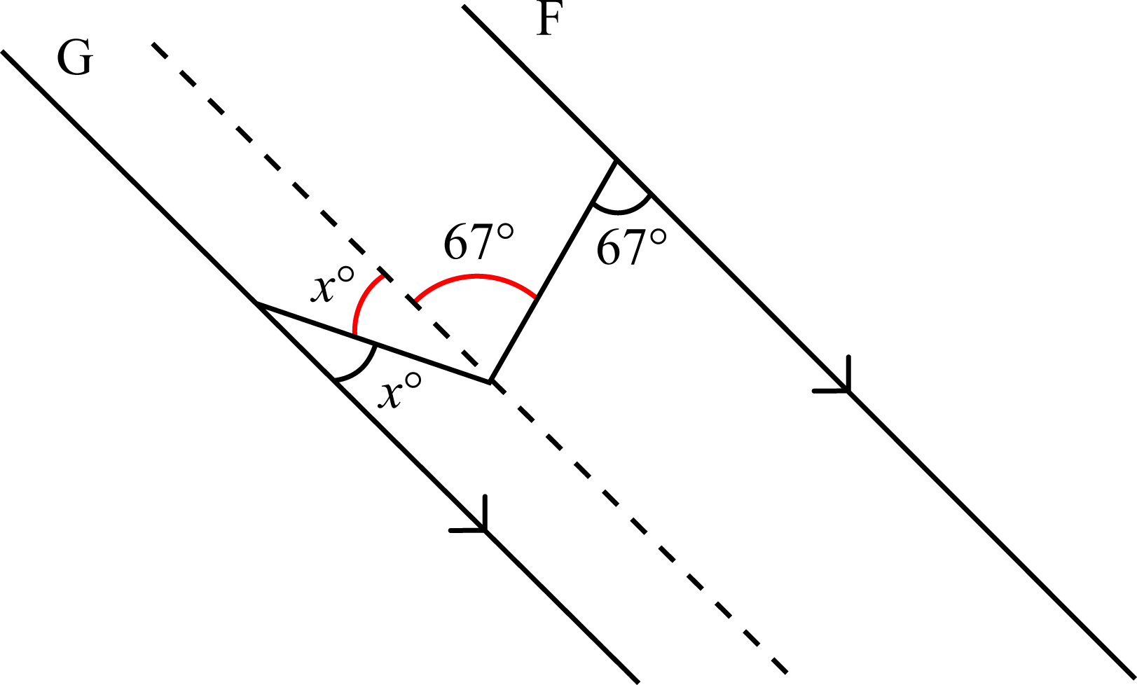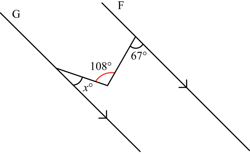 In the figure below, the lines `G` and `F` are parallel.