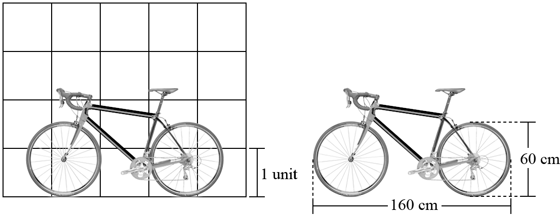 Geometry, NAP-C2-39 SA David drew a scale drawing of his road bike on a grid. What scale is David using for his picture? One unit on the grid represents cm Show Answers Only `40\ text(cm)` Show Worked Solution `text(Strategy 1:)` `1.5\ text(units)` `= 60\ text(cm)` `:. 1\ text(unit)` `= 60 ÷ 1.5` `= 40\ text(cm)` `text(Strategy 2:)` `4\ text(units)` `=160\ text(cm)` `:. 1\ text(unit)` `=160 -: 4` `=40\ text(cm)`