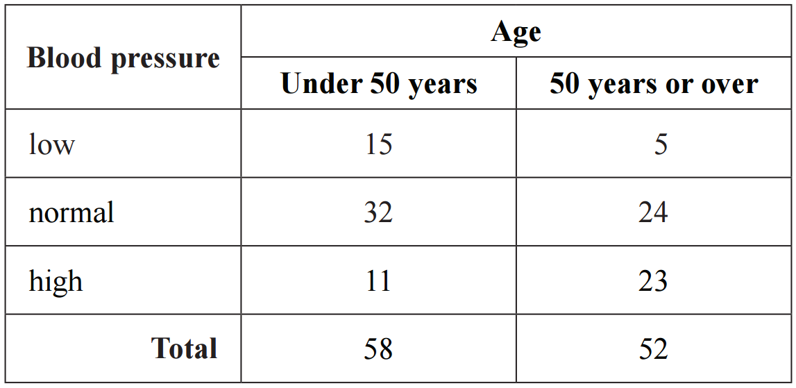 The blood pressure (low, normal, high) and the age (under 50 years, 50 years or over) of 110 adults were recorded. The results are displayed in the two-way frequency table below.