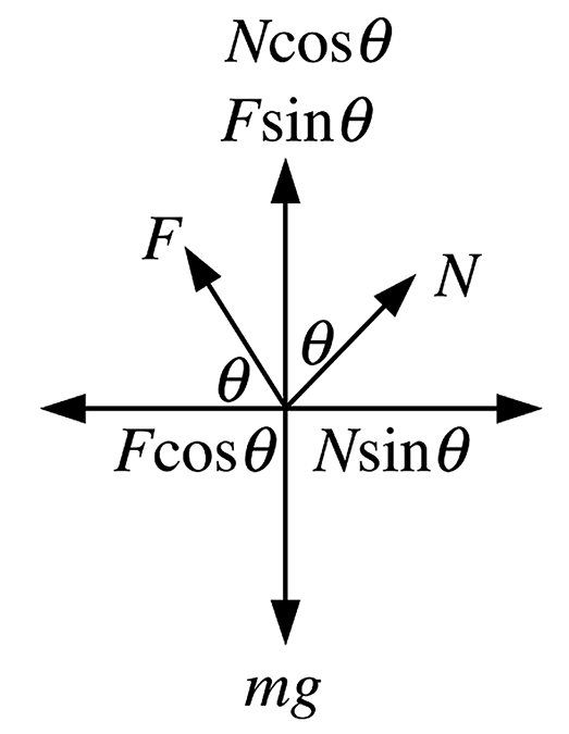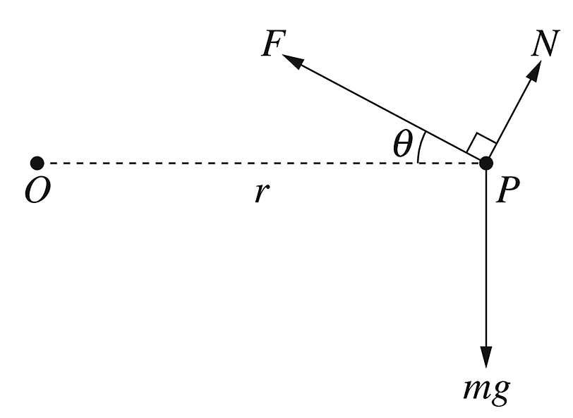 A particle `P` of mass `m` undergoes uniform circular motion with angular velocity `omega` in a horizontal circle of radius `r` about `O`. It is acted on by the force due to gravity, `mg`, a force `F` directed at an angle `theta` above the horizontal and a force `N` which is perpendicular to `F`, as shown in the diagram.