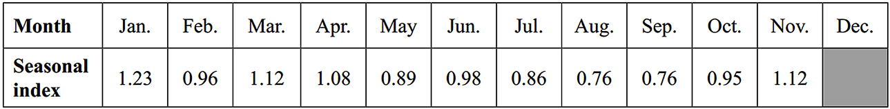 The seasonal indices for the first 11 months of the year, for sales in a sporting equipment store, are shown in the table below.