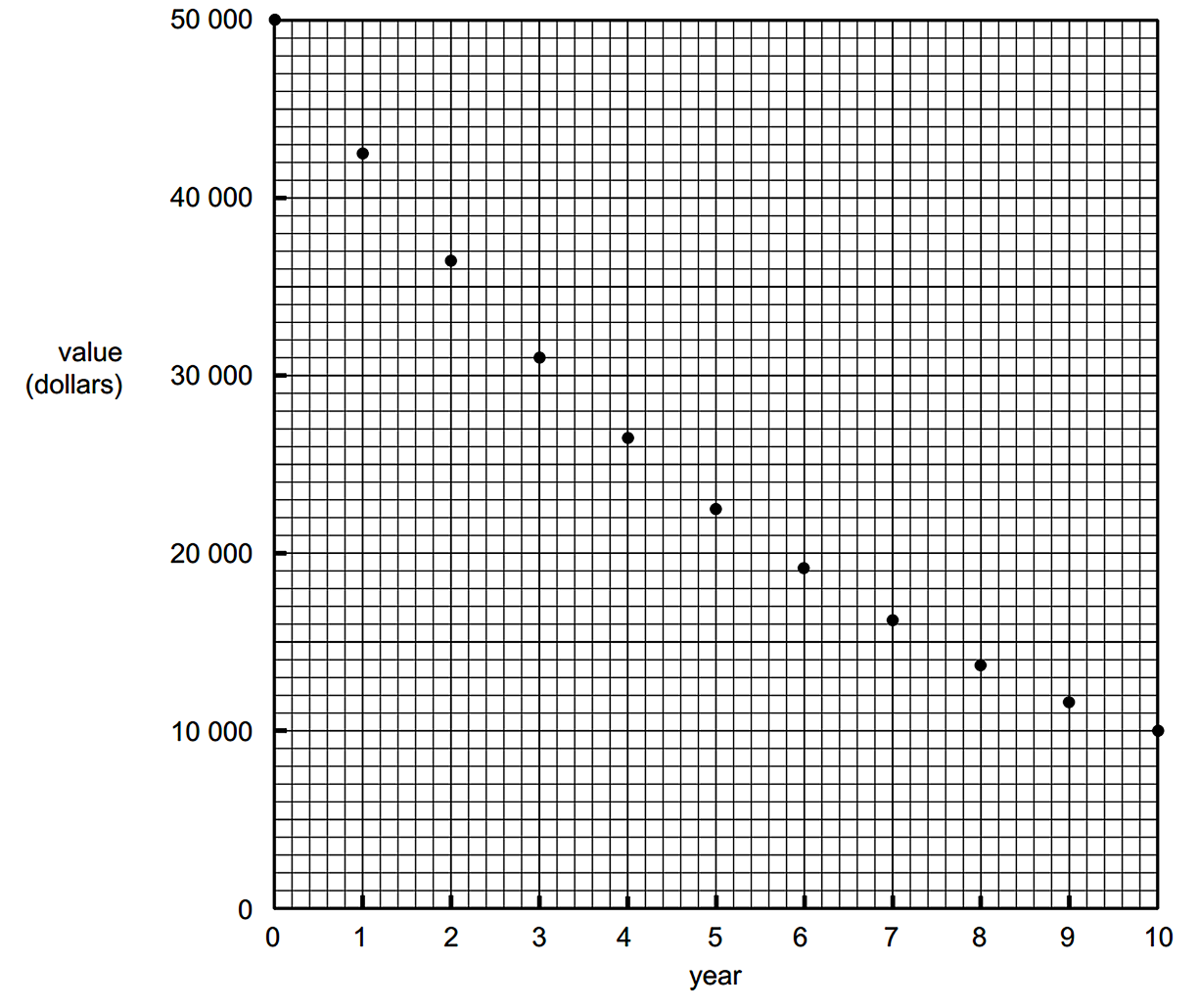 The value of the kitchen in dollars at the end of each year for ten years is shown in the graph below.