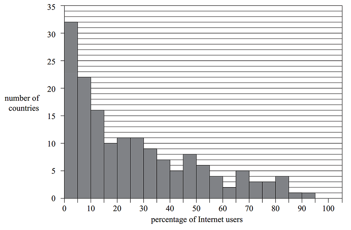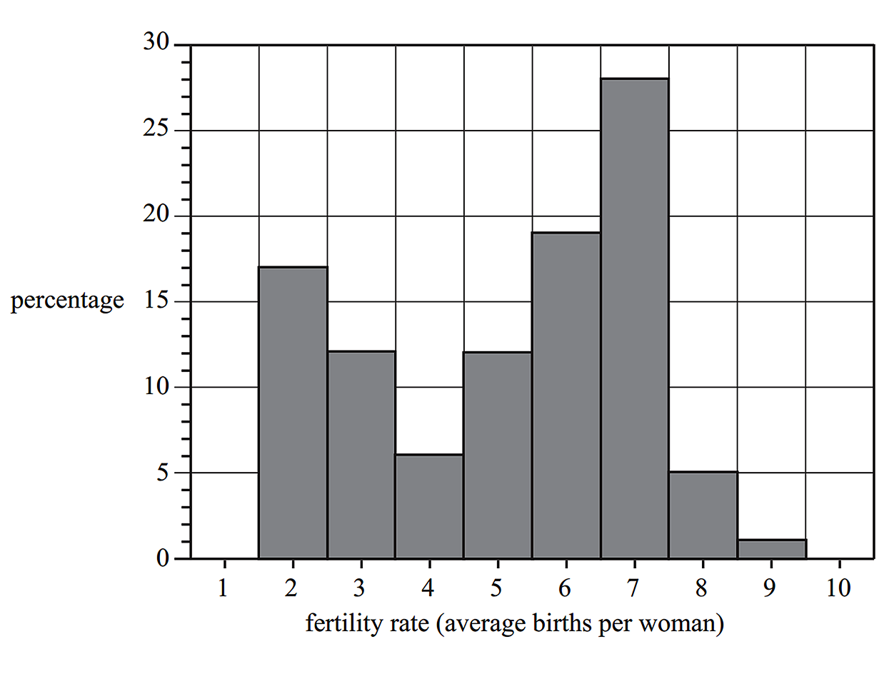 The percentage histogram below shows the distribution of the fertility rates (in average births per woman) for 173 countries in 1975.