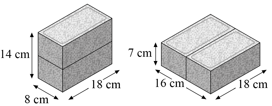 Two bricks can be joined to make three different rectangular prisms. Two of them are shown here.