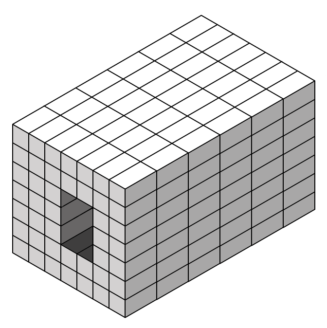 The structure is solid brick but has a hole that goes from one side to the other which is 3 bricks high and two bricks wide, as shown in the diagram.
