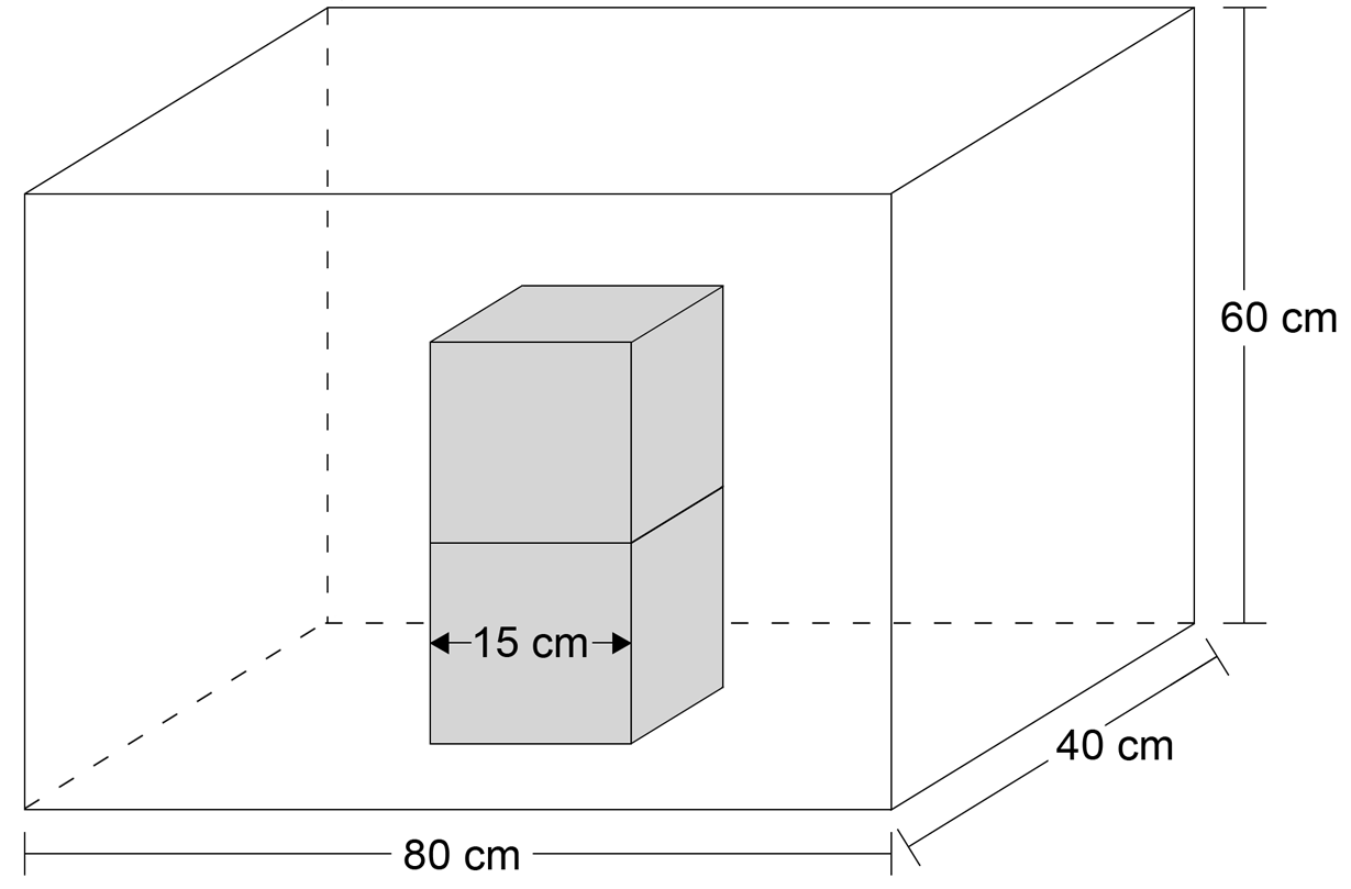 Two identical solid cubes are placed at the bottom of a fish tank.