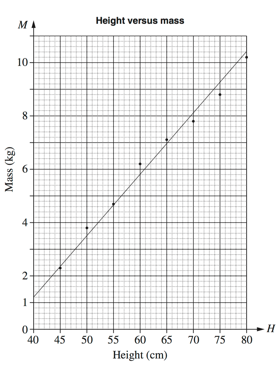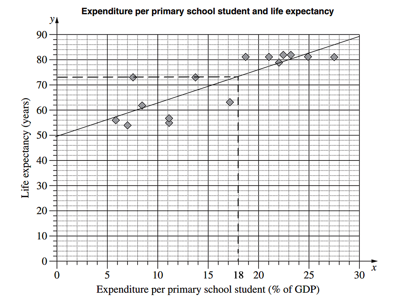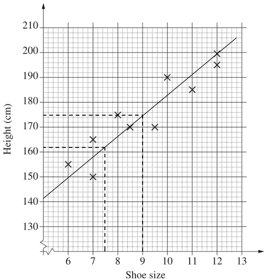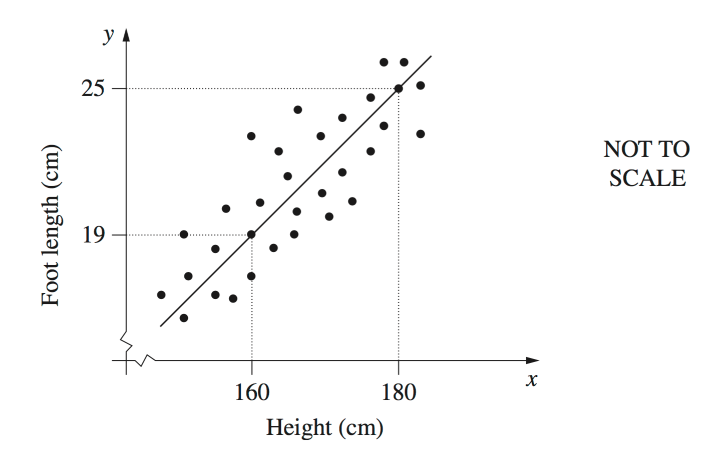 A scatterplot showing the data is drawn. The line of best fit with equation `y=-7.51+1.85 x`, is also drawn.