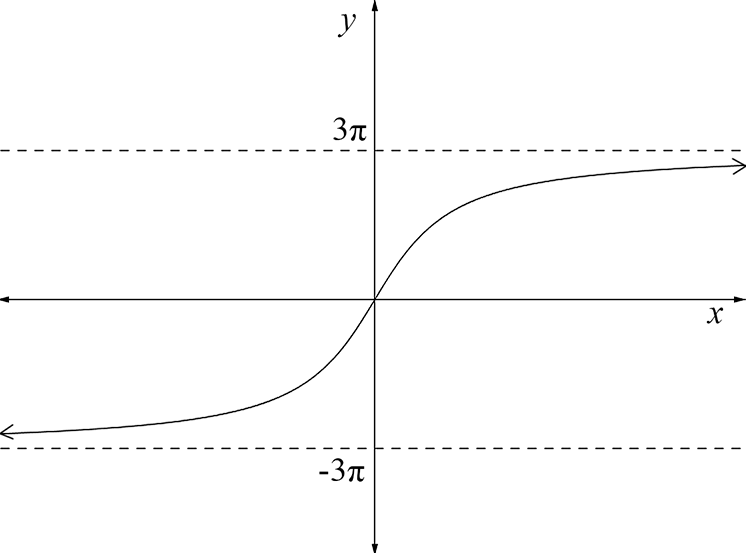 Trigonometry, EXT1 T1 2014 HSC 11c Sketch the graph `y = 6 tan^(-1)x`, clearly indicating the range. (2 marks) Show Answers Only Show Worked Solution `y = 6 tan^(-1)x`