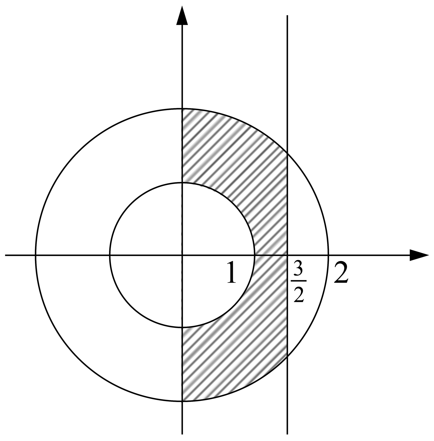 Sketch the region in the complex plane where the inequalities `1 ≤ |\ z\ | ≤ 2` and `0 ≤ z + bar z ≤ 3` hold simultaneously. (2 marks)
