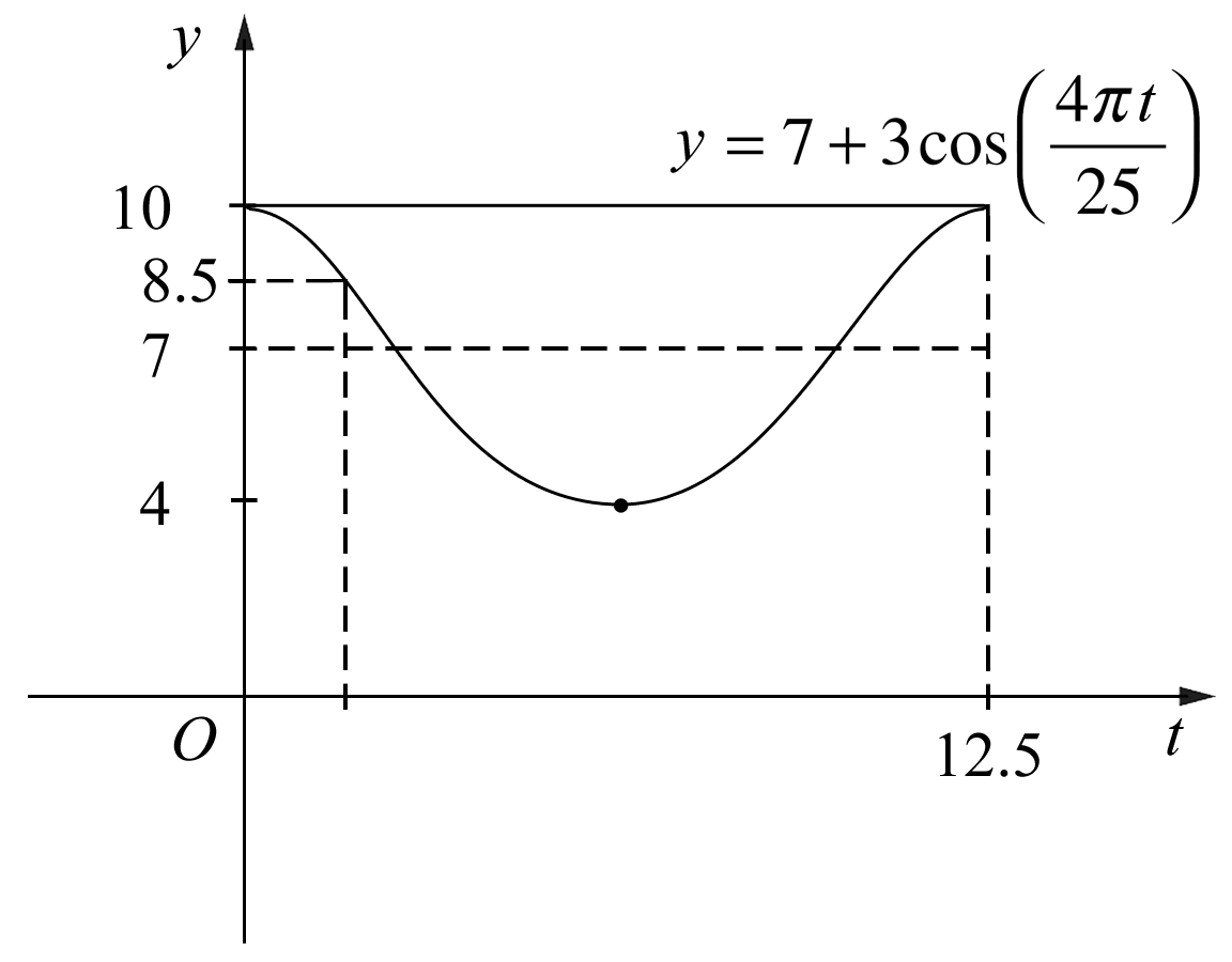 | `= 7 + 3 cos\ ((4pit)/(25))\ \ …\ text(as required.)` |