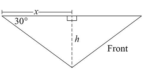 - Show that the area, `A`, of the top surface of the water is given by `A = 20 sqrt3 h`. (1 mark)
