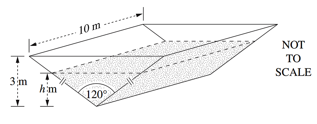 - Find the volume, `V`, of water in the tank when the depth of water is `h` metres. (1 mark)