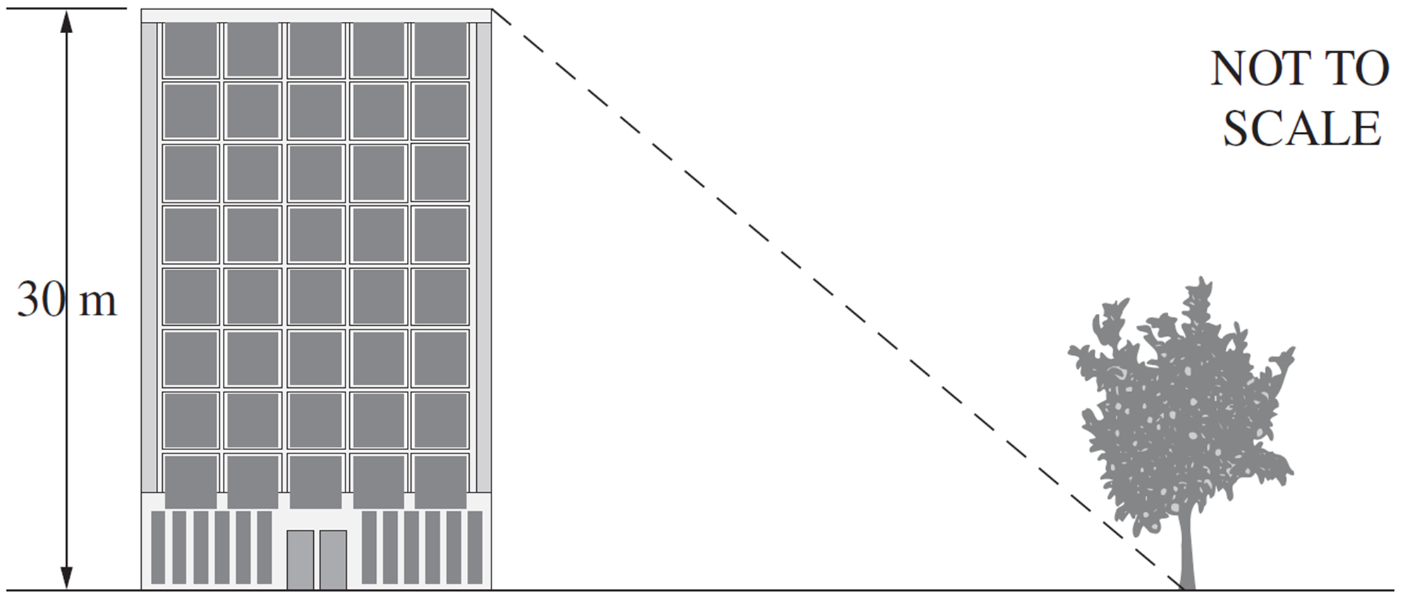 The angle of depression of the base of the tree from the top of the building is 65°. The height of the building is 30 m.