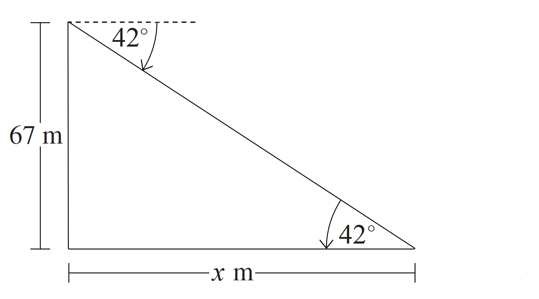From the top of a cliff 67 metres above sea level, the angle of depression of a buoy is 42°.
