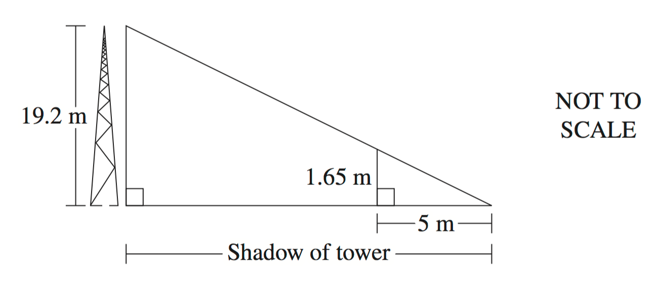A point `P` lies between a tree, 2 metres high, and a tower, 8 metres high. `P` is 3 metres away from the base of the tree.