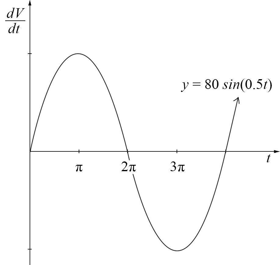 Find the volume of water in the tank when `\frac{dV}{dt}=0`. (3 marks)
