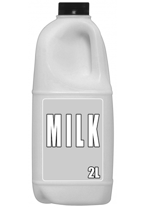 Measurement, NAP-H1-24 Which of these is closest to the mass of the two litre bottle of milk pictured below? `text(2 grams)` `text(20 grams)` `text(2 kilograms)` `text(20 kilograms)` Show Answers Only `text(2 kilograms)` Show Worked Solution `text(A litre contains 1000 milliliters and each)` `text(millilitre is equal to about 1 gram.)` `:. 2\ text(litres is equal to 2000 grams = 2 kilograms.)`