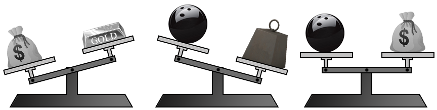 Measurement, NAP-I1-25 Dean balances four objects on a set of scales, as pictured below. Which object is the heaviest? Show Answers Only Show Worked Solution `text(The following logic solves the problem:)` `text(Money bag weighs more than the gold bar.)` `text(Bowling ball is the same weight as the money bag.)` `text(Lead weight is heavier than the bowling ball.)` `=>\ text(Lead weight must be heaviest.)`