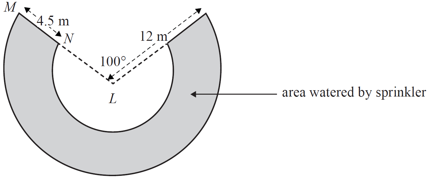 A golf course has a sprinkler system that waters the grass in the shape of a sector, as shown in the diagram below.