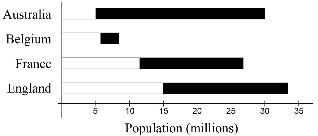 Each bar on this graph shows the population of a country and the population of its capital city.