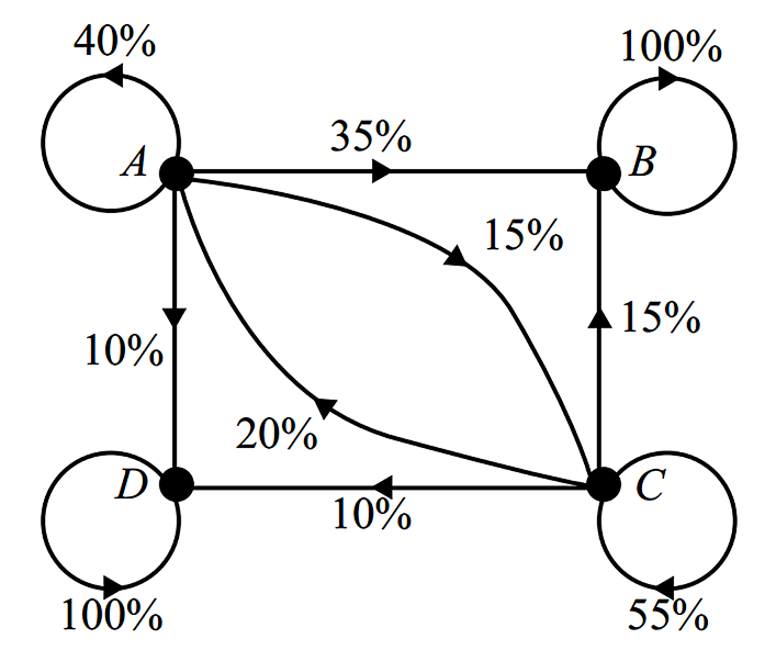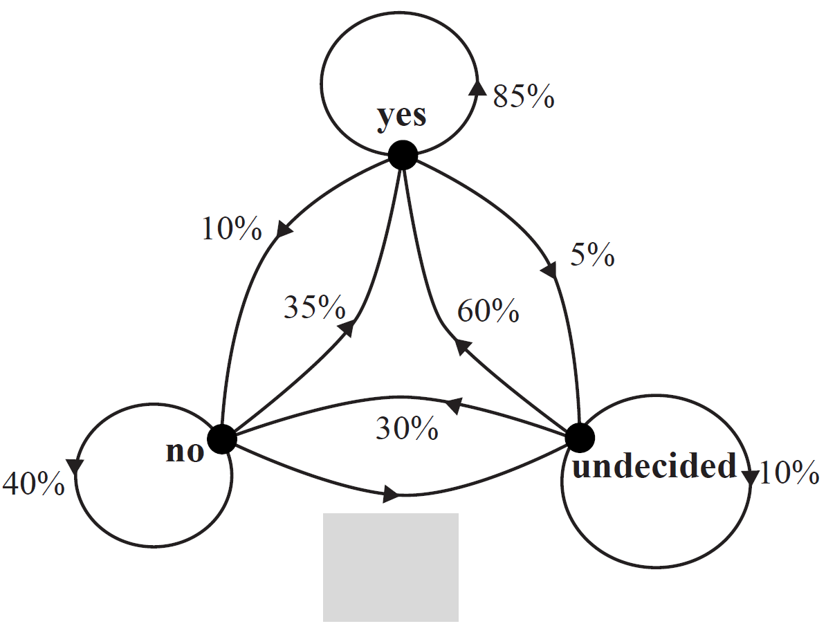 During the election campaign, it is expected that people may change the candidate that they plan to vote for each week according to the following transition diagram.
