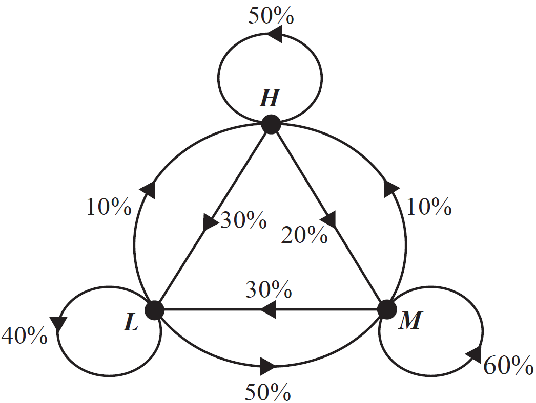 `{:(qquadqquadqquadquad\ text(this week)),((qquadqquadqquadH,quadM,\ L)),(T = [(0.5,0.1,0.1),(0.2,0.6,0.5),(0.3,0.3,0.4)]{:(H),(M),(L):}qquad{:text(next week):}):}`