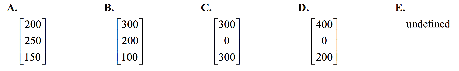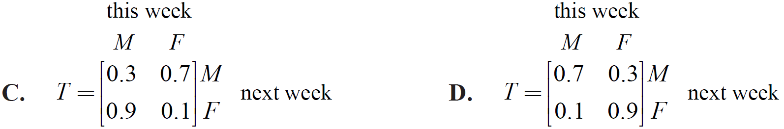 `{:(qquadqquadqquadqquadqquadtext(this year)),((qquadqquadqquadE,quad\ B,quad\ A,\ D)),(T = [(0,0,0,0),(0.4,0,0,0),(0,0.25,0.5,0),(0.6,0.75,0.5,1)]):}{:(),(),(E),(B),(A),(D):}{:(),(),(qquadtext(next year)):}`