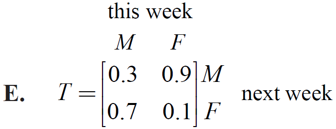 `{:(quad qquad qquad qquad qquad qquad qquad qquad text(this week)),(qquad qquad qquad qquad qquad qquad quad \ W qquad quad G qquad quad \ E),(text(where)\ T = [(quad 0.80, 0.09, 0.10),(quad 0.12, 0.79, 0.10),(quad 0.08, 0.12, 0.80)]{:(W),(G),(E):}\ text(next week,) qquad qquad S_0 = [(250\ 000), (230\ 000), (200\ 000)]{:(W),(G),(E):}):}`