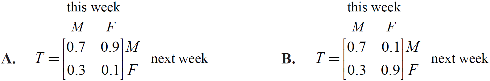`{:(quadqquadqquadqquadquad t\oday),(qquadqquadqquadquad F quadqquad G),(T = [(0.85,0.35),(0.15,0.65)]{:(F),(G):}qquad t\omo\rrow):}`