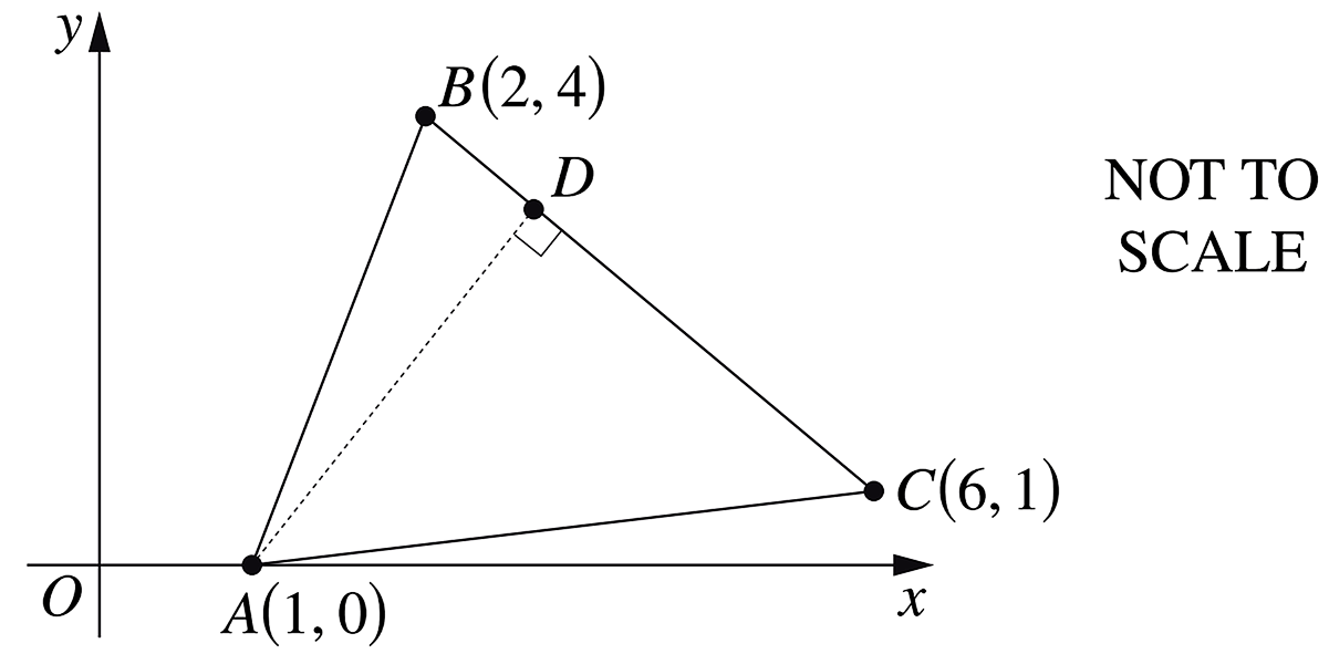 The diagram shows points `A(1, 0), B(2, 4)` and `C(6, 1).` The point `D` lies on `BC` such that `AD _|_ BC.`