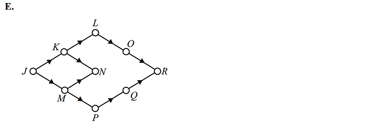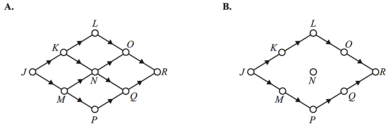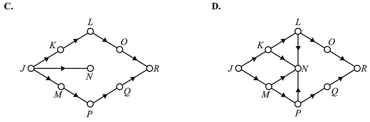 A digraph that shows all the possible moves that a player could make to reach `N` or `R` from `J` is