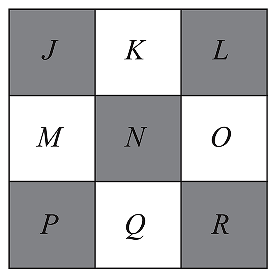 A player must start at square `J` and, moving one square at a time, aim to finish at square `R`.