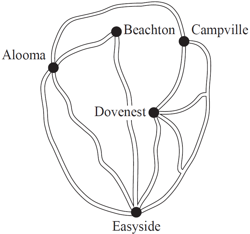 A map of the roads connecting five suburbs of a city, Alooma (`A`), Beachton (`B`), Campville (`C`), Dovenest (`D`) and Easyside (`E`), is shown below.