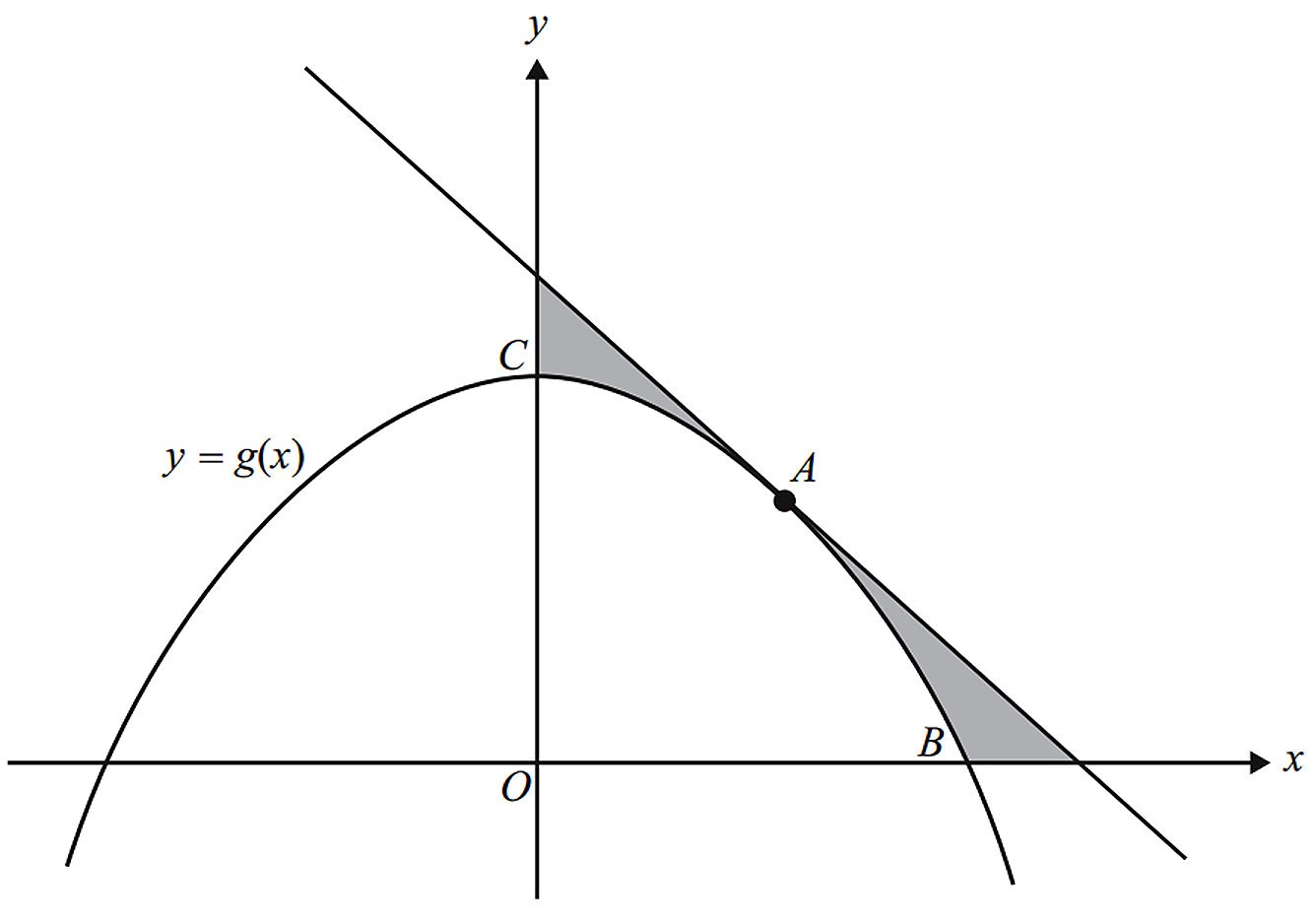 The shaded region shown in the diagram above is bounded by the graph of `g`, the tangent at the point `A`, and the `x`-axis and `y`-axis.