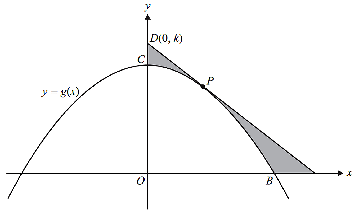 The tangent to the graph of `g` at a point `P` has a negative gradient and intersects the `y`-axis at point `D(0, k)`, where `5 <= k <= 8.`
