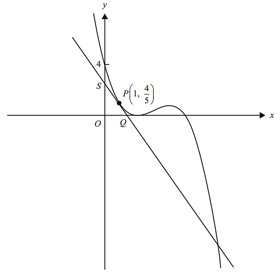 - i. Find the equation of the tangent to the graph of `f` at the point `P(1, 4/5)`. (1 mark)
