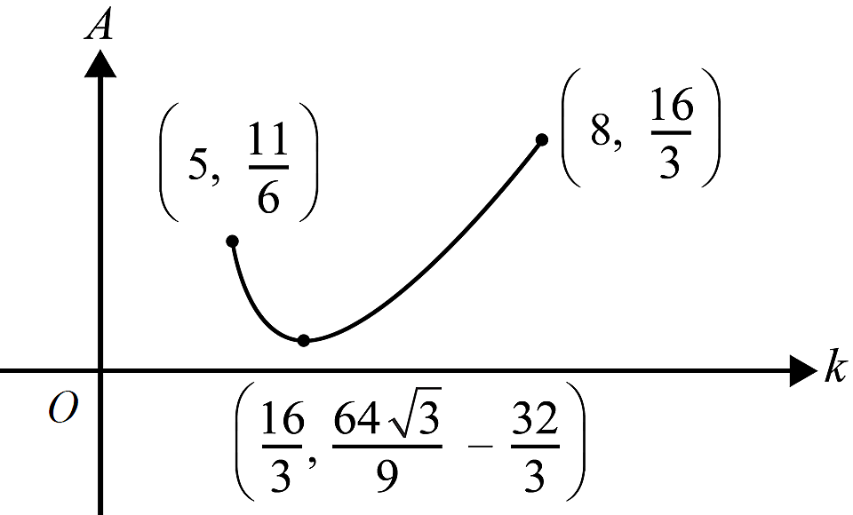 - iii. Find the minimum area of the shaded region and the value of `k` for which this occurs. (2 marks)