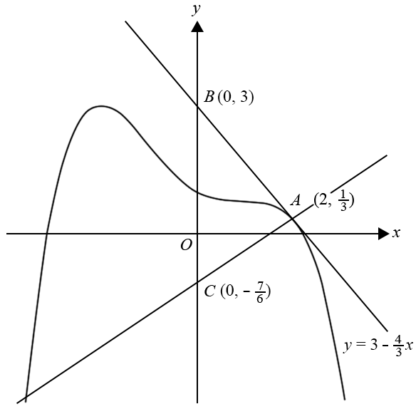 The diagram below shows part of the graph of `y = g(x)`, the tangent to the graph at `x = 2` and a straight line drawn perpendicular to the tangent to the graph at `x = 2`. The equation of the tangent at the point `A` with coordinates `(2, g(2))` is `y = 3-(4x)/3`.