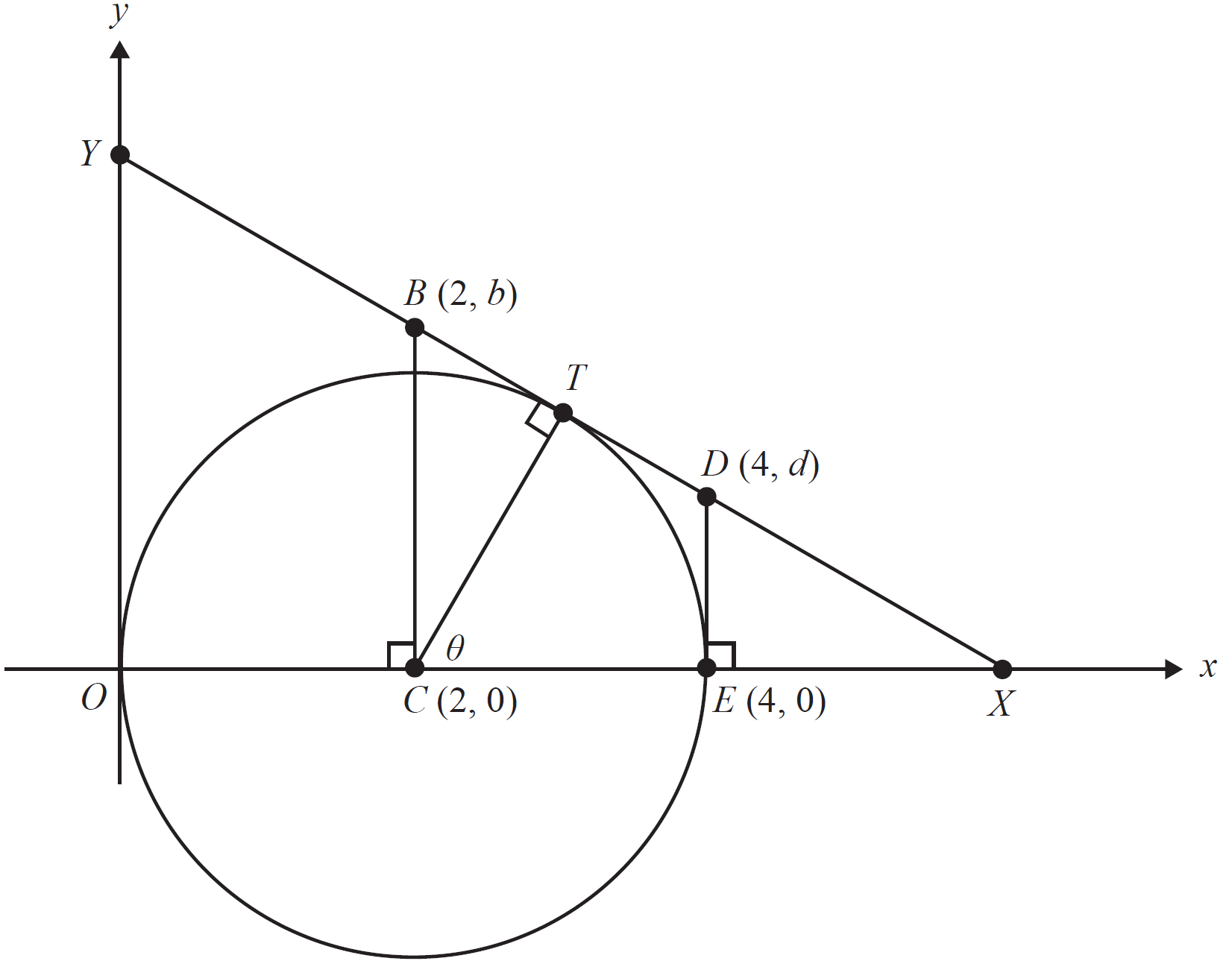The diagram also shows the tangent to the circle at `T`. This tangent is perpendicular to `CT` and intersects the `x`-axis at point `X` and the `y`-axis at point `Y`.