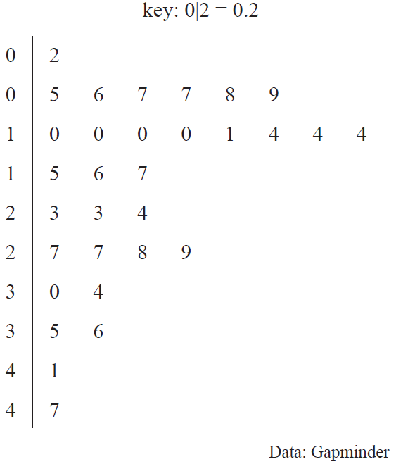 The stem plot below displays the average number of decayed teeth in 12-year-old children from `31` countries.