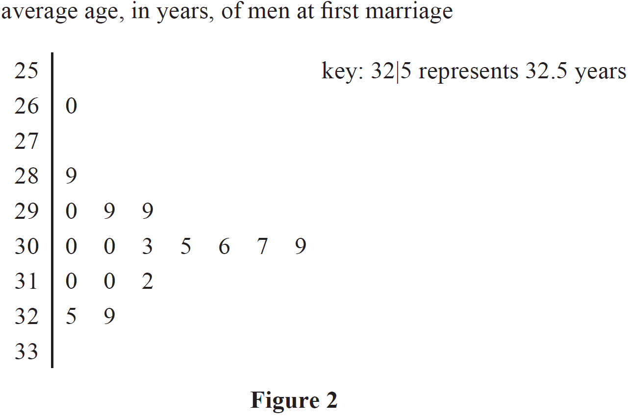 The stemplot in Figure 1 shows the distribution of the average age, in years, at which women first marry in 17 countries. --- 1 WORK AREA LINES (style=lined) --- --- 1 WORK AREA LINES (style=lined) --- The stemplot in Figure 2 shows the distribution of the average age, in years, at which men first marry in 17 countries. --- 3 WORK AREA LINES (style=lined) --- --- 4 WORK AREA LINES (style=lined) ---