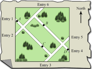 Brian enters a park at one of the entries shown below.