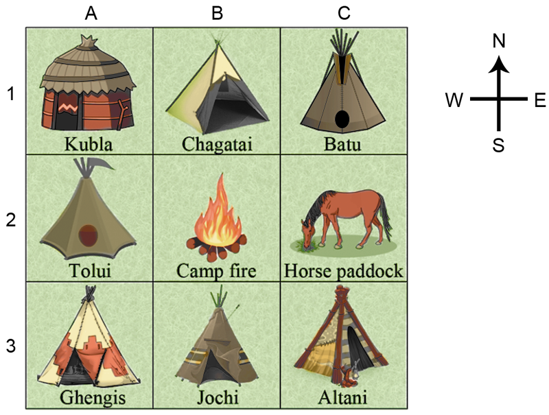 A map of the huts in Ghengis Khan's camp is drawn below.