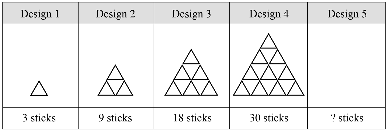 `=>\ text(Design 5 will have 5 triangles on the bottom row.)`