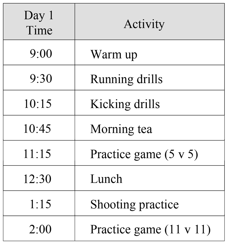 Measurement, NAP-C1-28 A holiday soccer camp has the plan below for Day 1. At 1:00, the soccer players will be doing kicking drills. having morning tea. eating lunch. having shooting practice. Show Answers Only `text(eating lunch.)` Show Worked Solution `text(eating lunch.)`